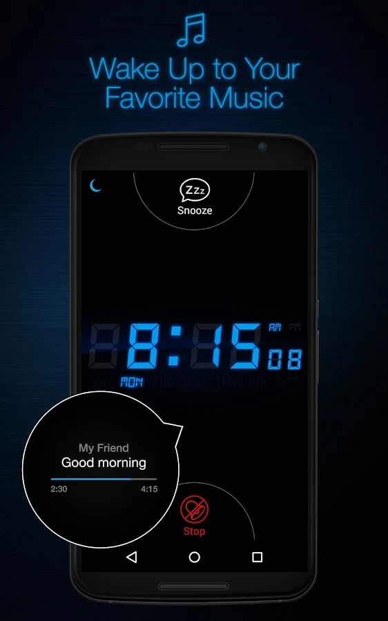 • Non-stop alarm: music goes on until you stop or snooze it.
